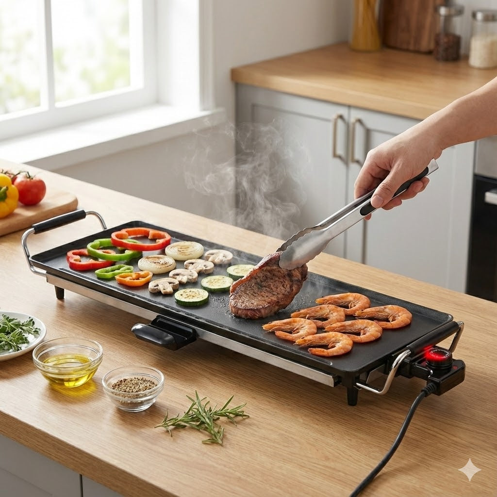 مثالي لشواء اللحوم، الدجاج، الخضروات، المأكولات البحرية، والكثير! السطح الواسع يسمح بطهي كميات كبيرة في نفس الوقت، مما يجعله مثالياً للعائلات والحفلات. الطبقة غير اللاصقة تضمن طهياً صحياً وسهولة في التنظيف.