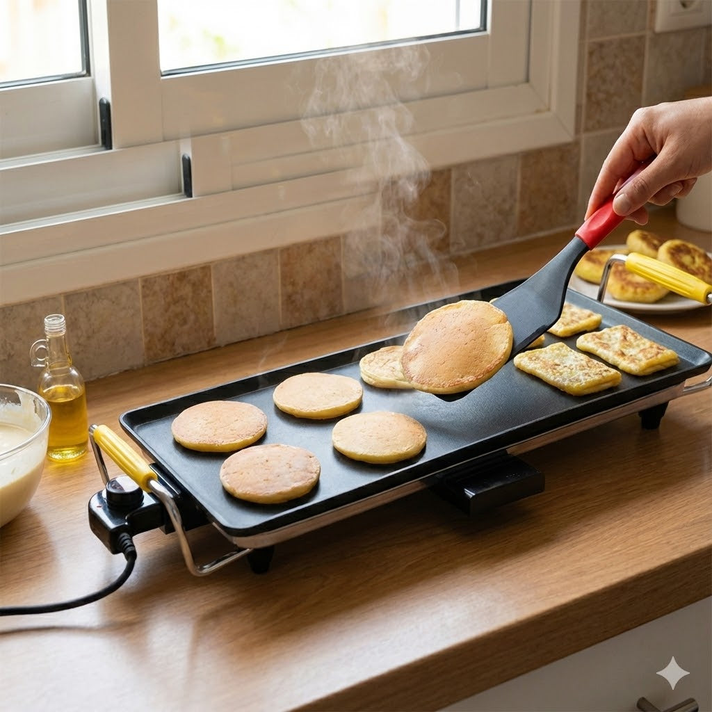 لوحة كهربائية احترافية من Lamacom بقوة 2000 واط، مثالية لتحضير الفطائر، البغرير، المسمن، الكريب، والمعجنات. سطح طهي واسع غير لاصق بمساحة 23×70 سم مع مقابض عملية.